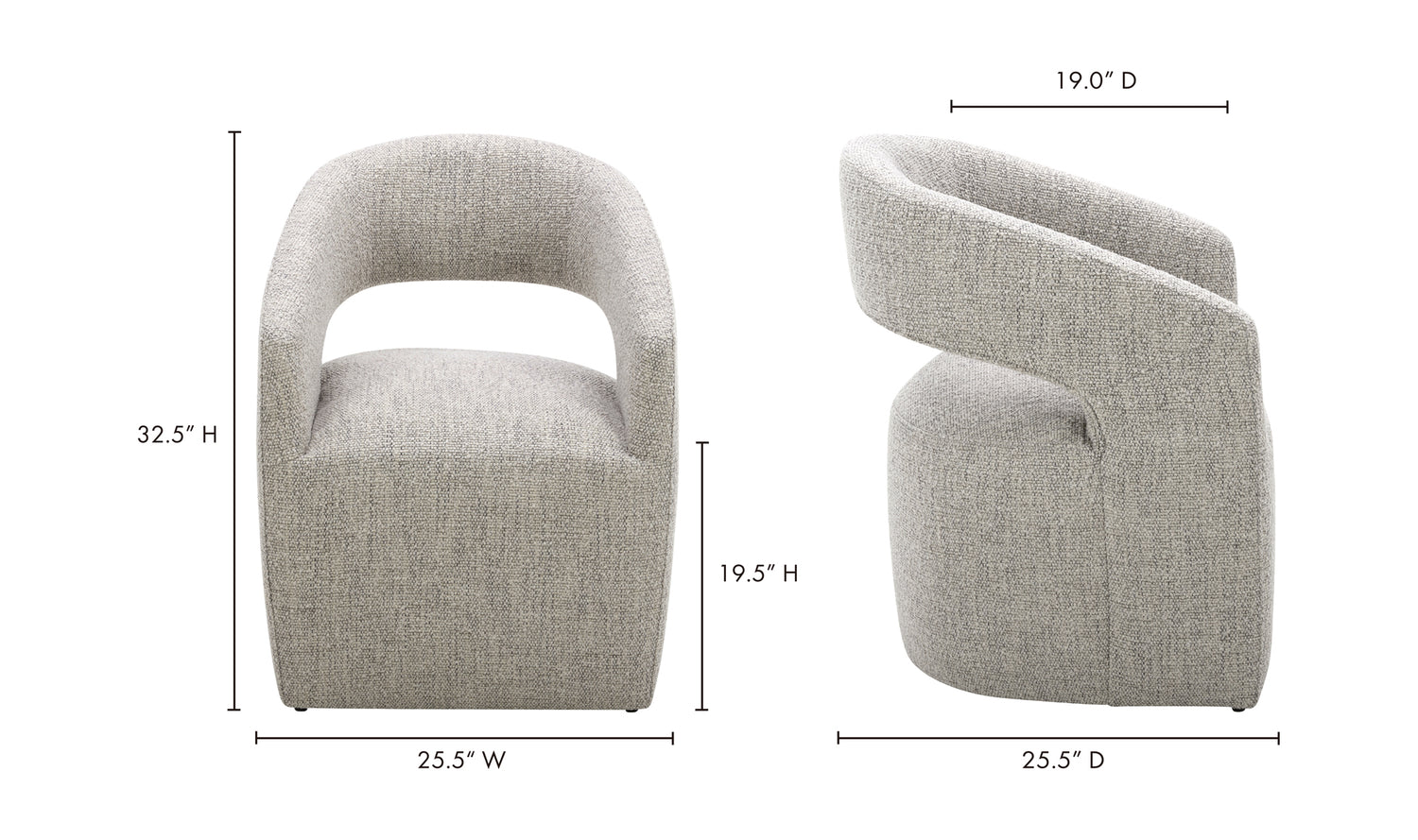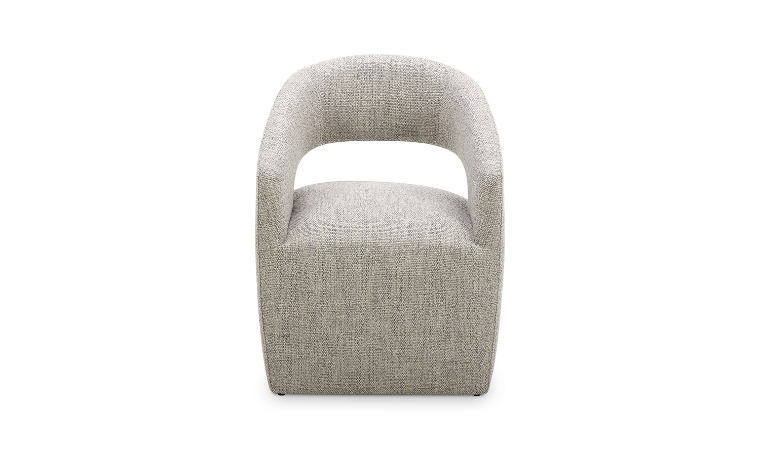 The Barrow dining chair combines contemporary style with practical functionality, featuring NeverFear performance boucle upholstery that is both easy to clean and visually appealing. Its rolling base allows for effortless movement, making it easy to join in on conversations. The curved back, paired with ultra-comfortable feather, high-density foam, and poly-fill cushioning, brings living room comfort to your dining experience.
