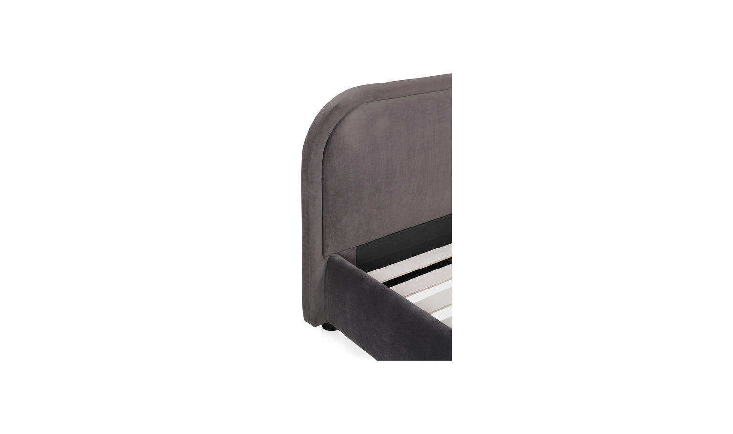 Experience ultimate relaxation with the Colin bed, designed to offer pure bliss and rejuvenation. Its gracefully curved frame and headboard, upholstered in luxurious dark grey bouclé, create a stress-free, padded environment. The gentle lines and rounded corners promote tranquility, while the dark, subtly exposed wooden post legs add stability and a touch of sophistication. The Colin bed is practically a dreamy cloud, inviting you to unwind and let your worries drift away.