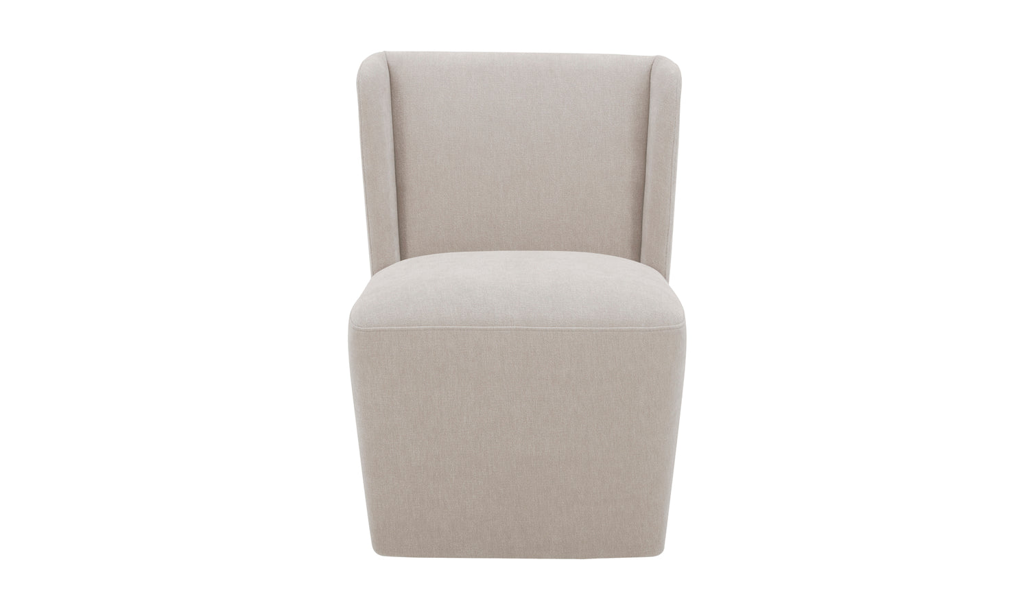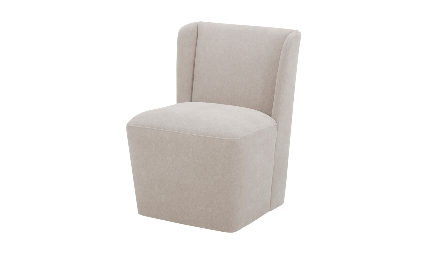 The Cormac rolling dining chair prioritizes comfort with its generously padded seat and backrest, featuring a slight curve for added support. The caster wheels glide effortlessly across the floor, making it a practical choice. Crafted from high-performance fabric, it is soft to the touch and resilient against stains, spills, and daily wear.