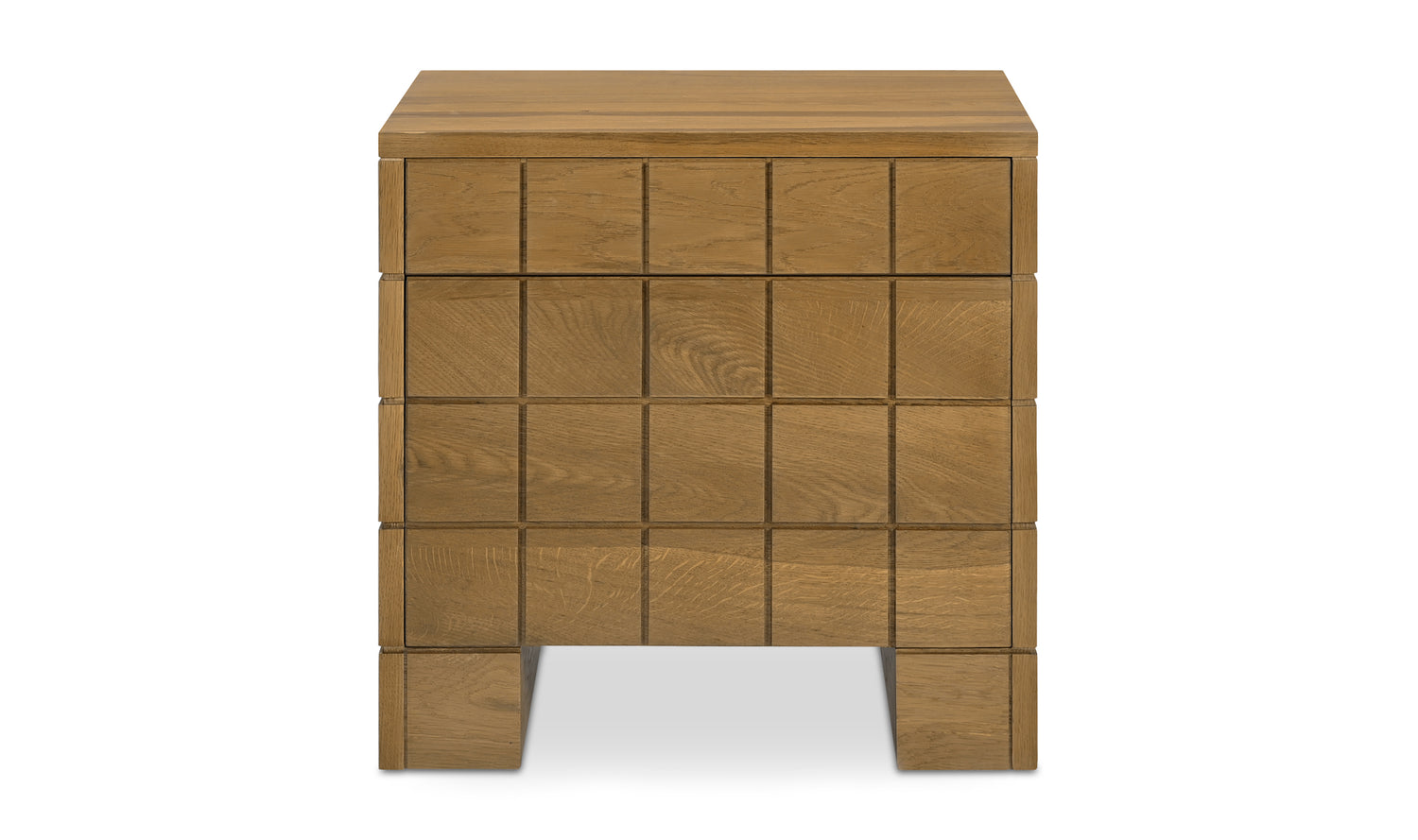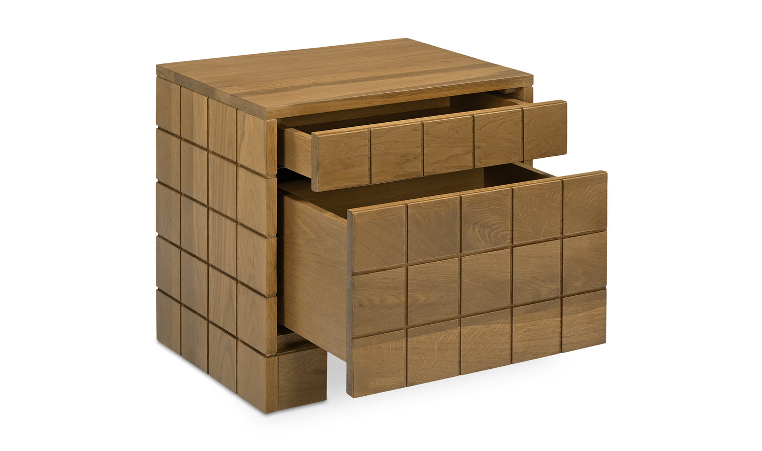 The nightstand’s striking geometric design highlights the oak wood’s mid-tone brown finish, allowing it to blend seamlessly into various interiors with subtle sophistication. This piece features a unique geometric arrangement while maintaining a light, airy feel.