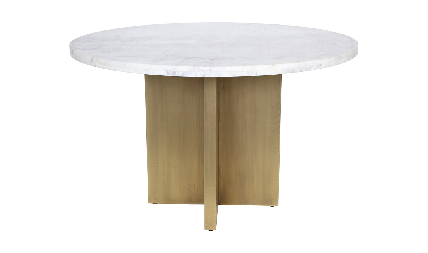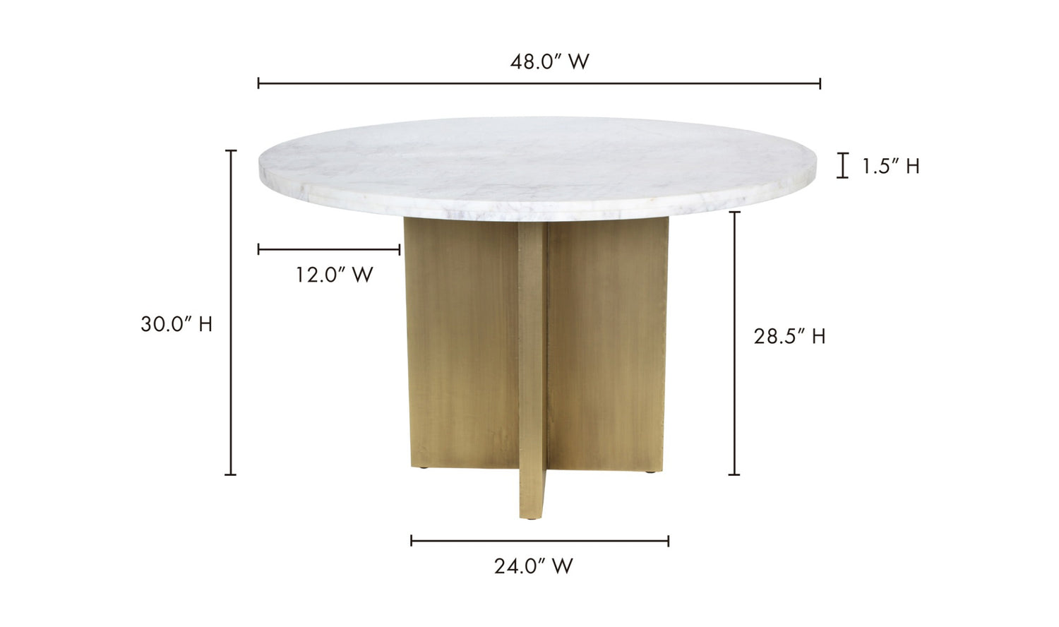 Elevate your dining space with the stunning and contemporary design of the Graze dining table. Featuring a sleek white marble tabletop and a bold, brass-finished iron base, this table combines elegance with modern flair. Its circular design comfortably seats four, making it an ideal choice for stylish condo living.