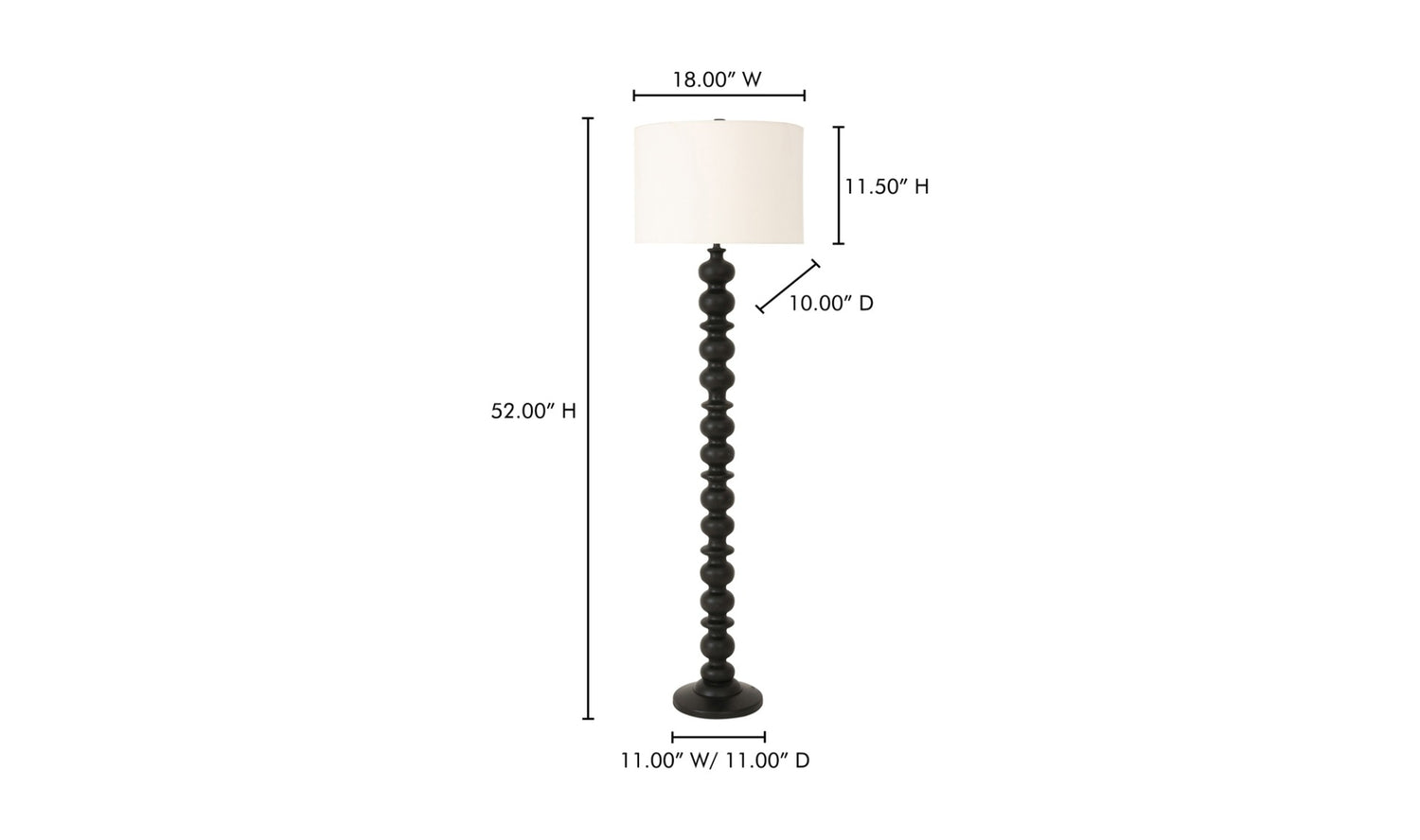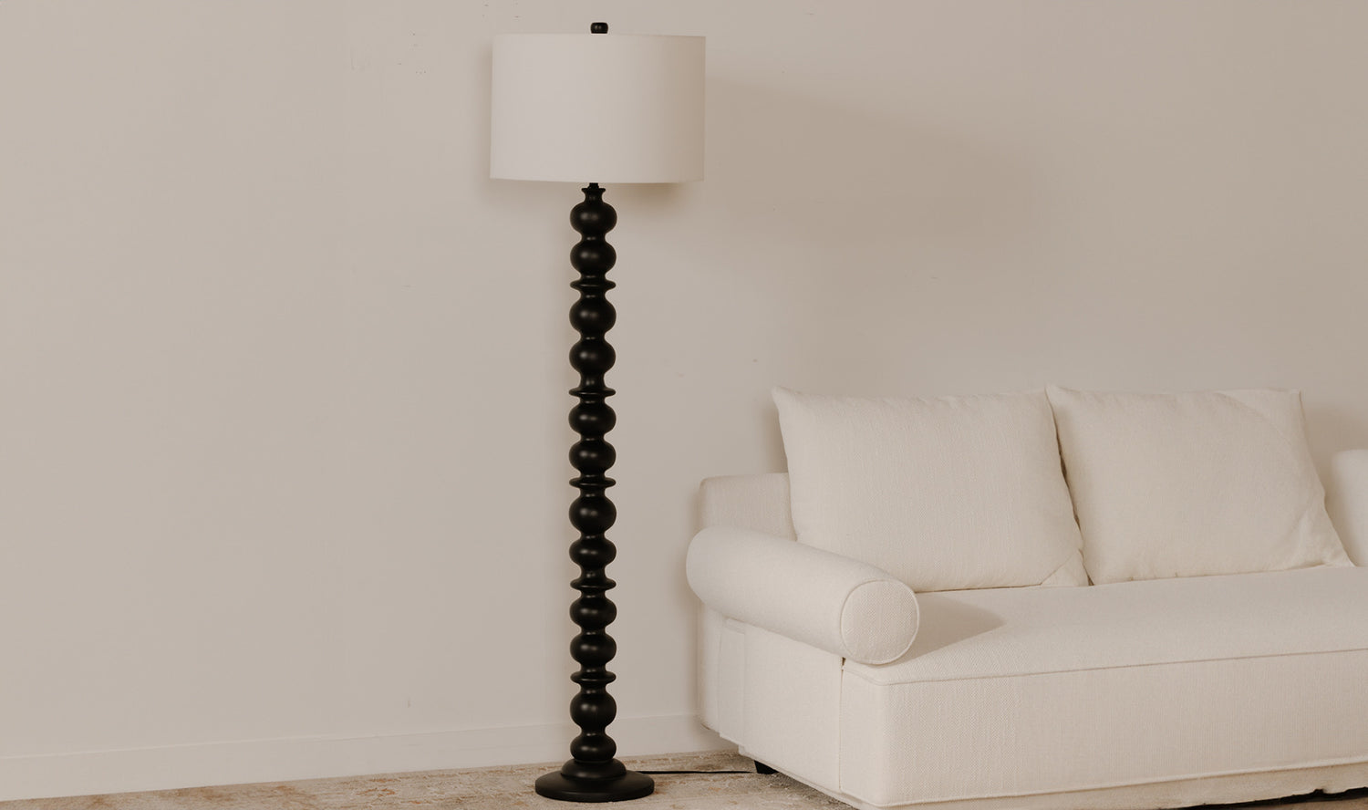 Inspired by vintage table legs for an heirloom aesthetic, the Gwen floor lamp showcases a black-finished mango wood base with a beautifully turned, spherical design. The textured cotton shade adds dimension to the smooth, organic form, creating a striking yet timeless piece.
