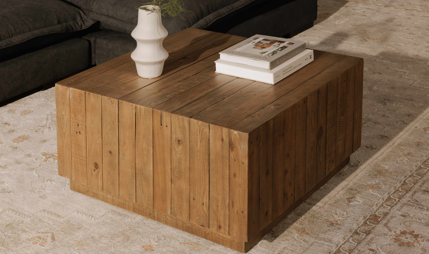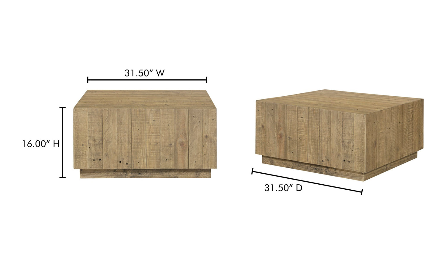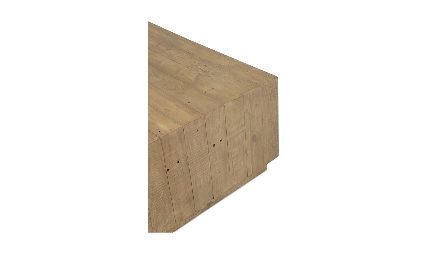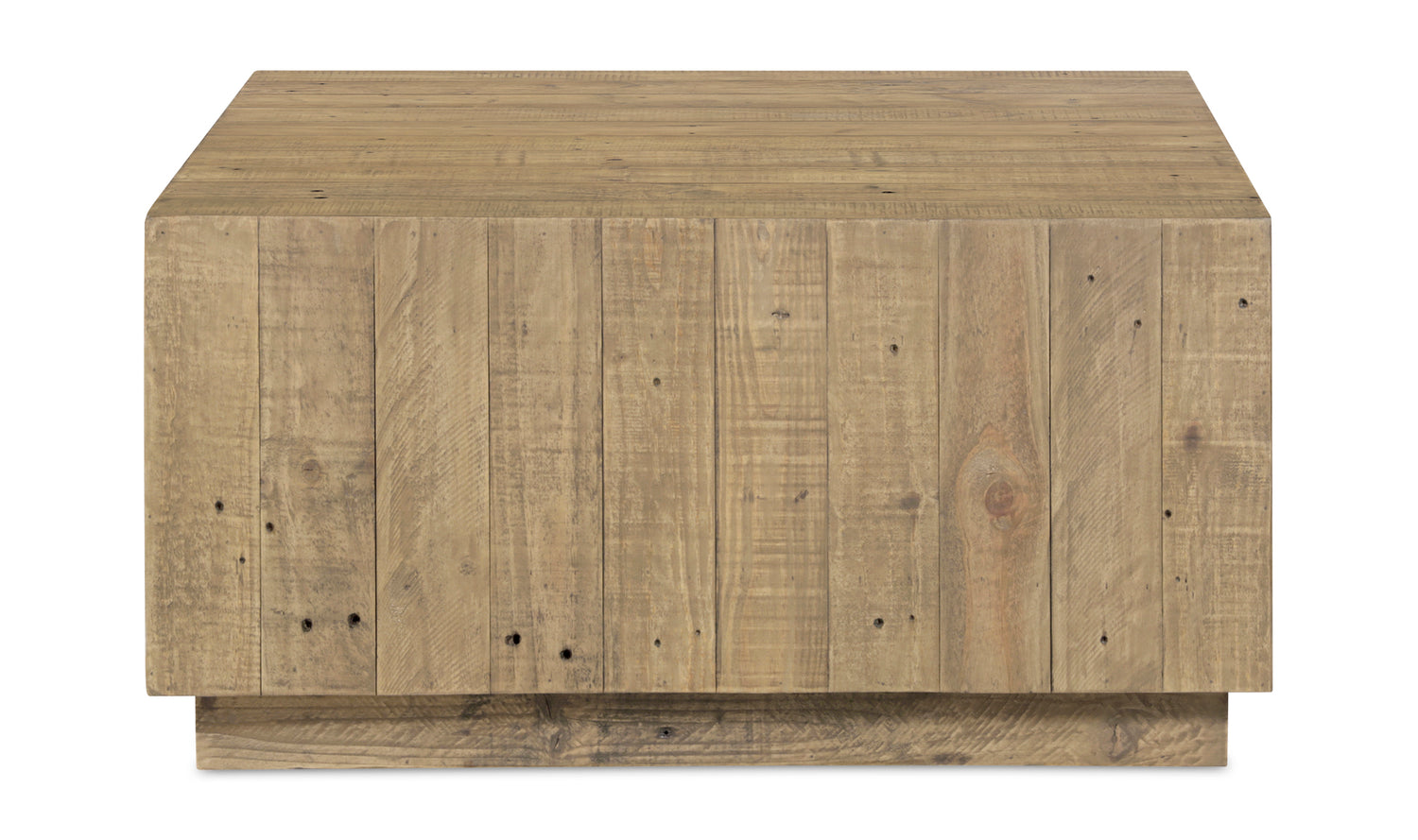 The Jasper coffee table features reclaimed pine construction that highlights its clean lines and simple form. This eco-friendly piece boasts unique markings, knots, and nail holes, adding vintage charm and character. Its detailed joinery and pedestal base enhance the overall design, while the hollow interior allows for easy mobility, making it a versatile addition to any space.