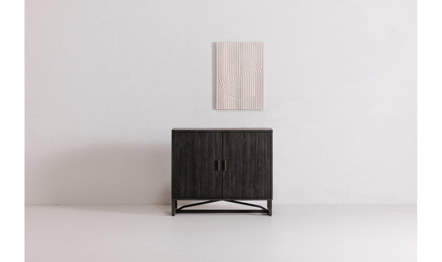 Inspired by the whimsical designs of the 1960s and 70s, the Knott carved wood wall art features a repetitive curved pattern that softens the bold look of solid mango wood with intricate carvings. It is finished with an aged black wash for a distinctive and striking appearance.
