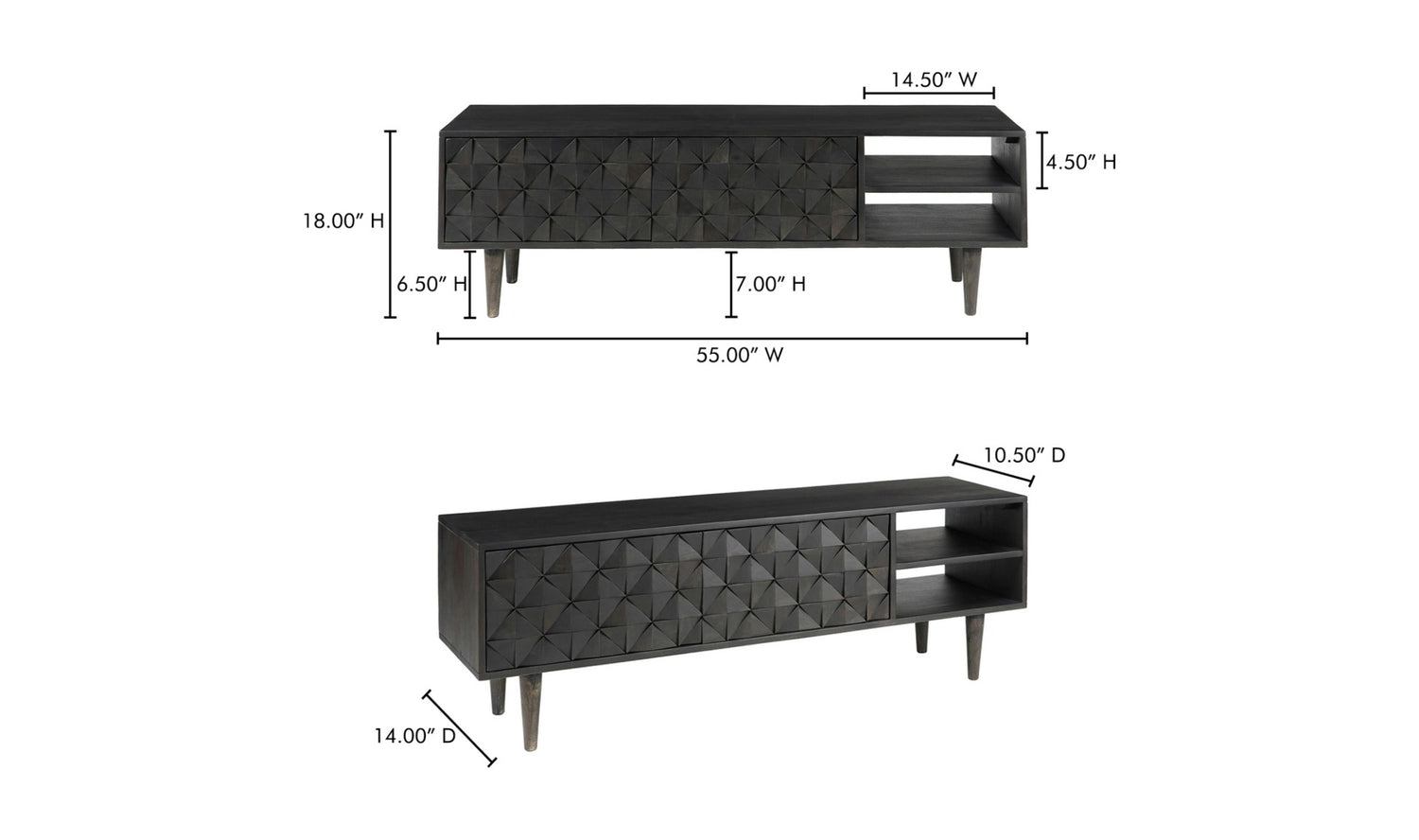 Crafted from blackened solid Sheesham wood, the Pablo entertainment unit showcases intricate mid-century design on its striking front. Two uniquely engraved push-to-open cabinet doors provide easy access to ample shelving storage for all your media essentials and entertainment accessories. With its blend of practicality and stunning craftsmanship, this unit brings both functionality and artistry to your living space. Each piece is unique, reflecting the natural variations in the wood’s grains and knots.