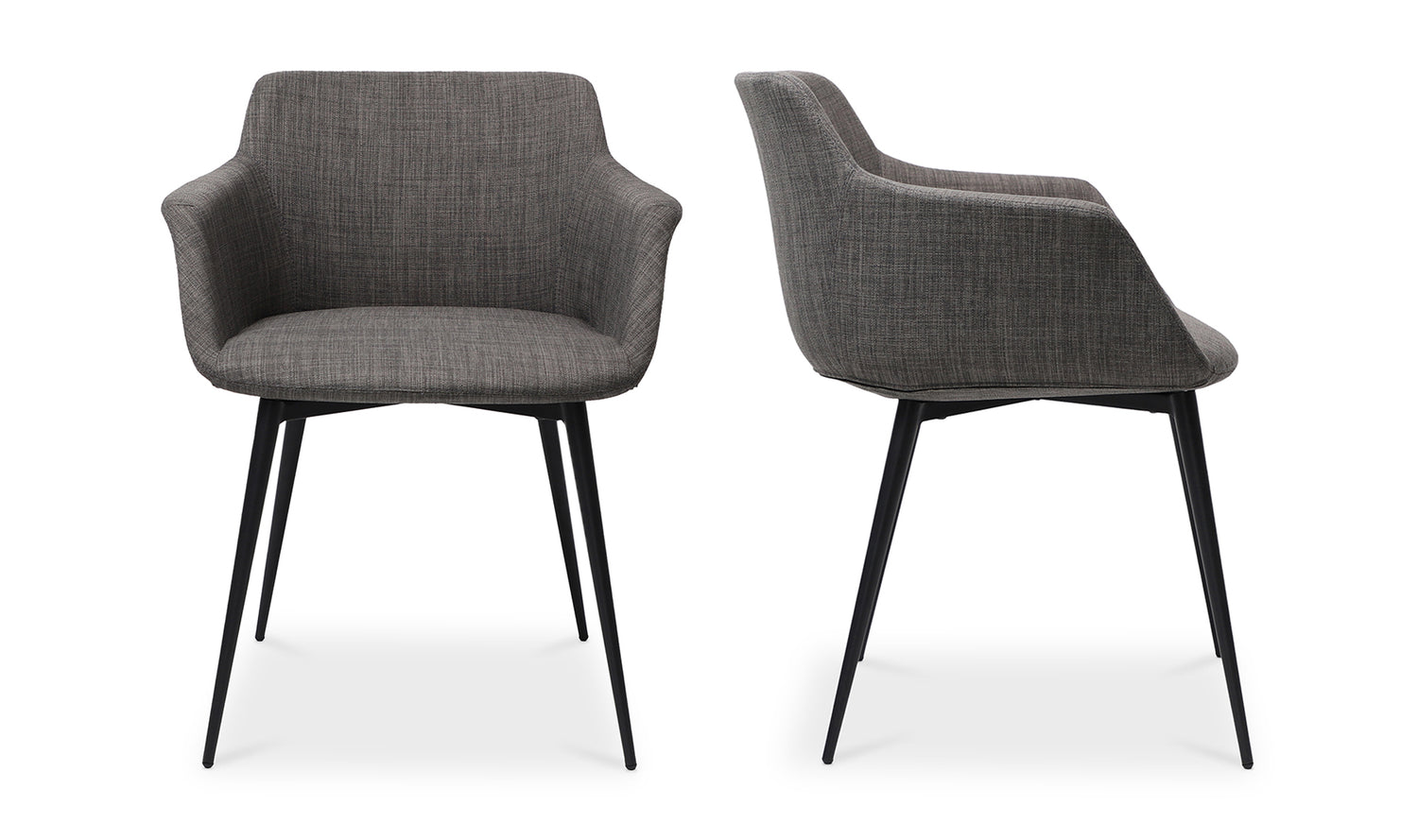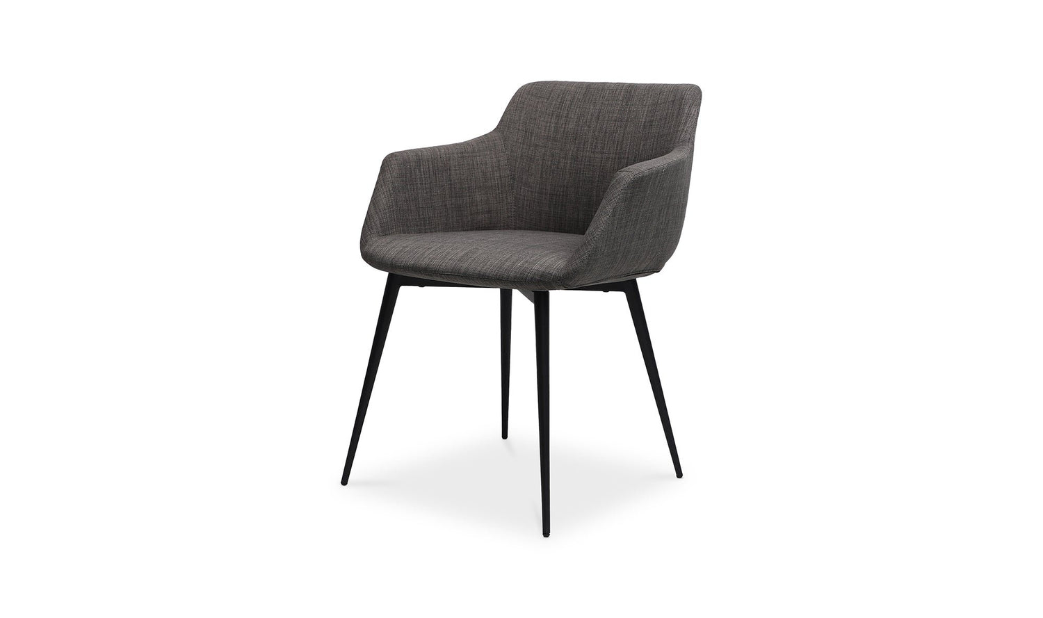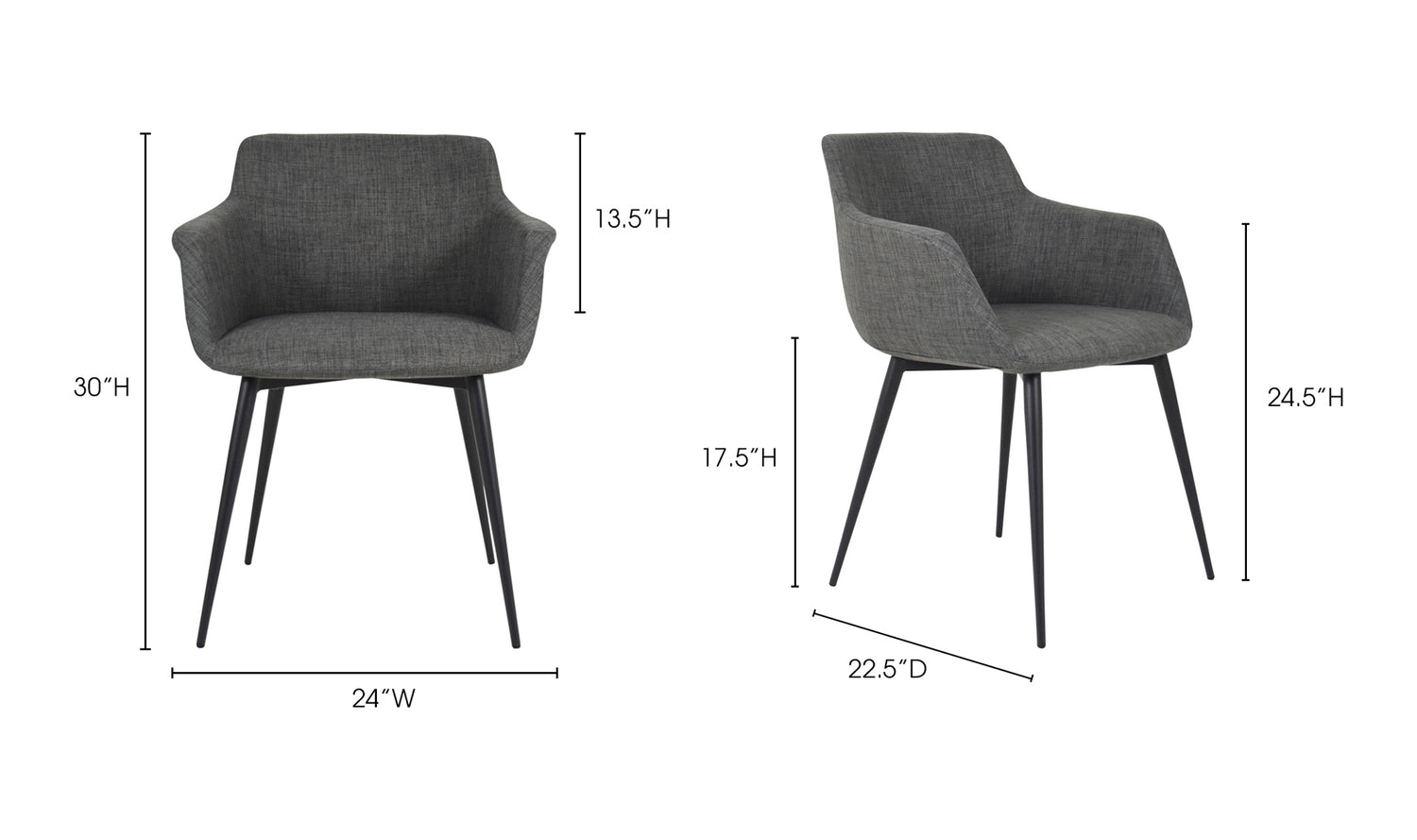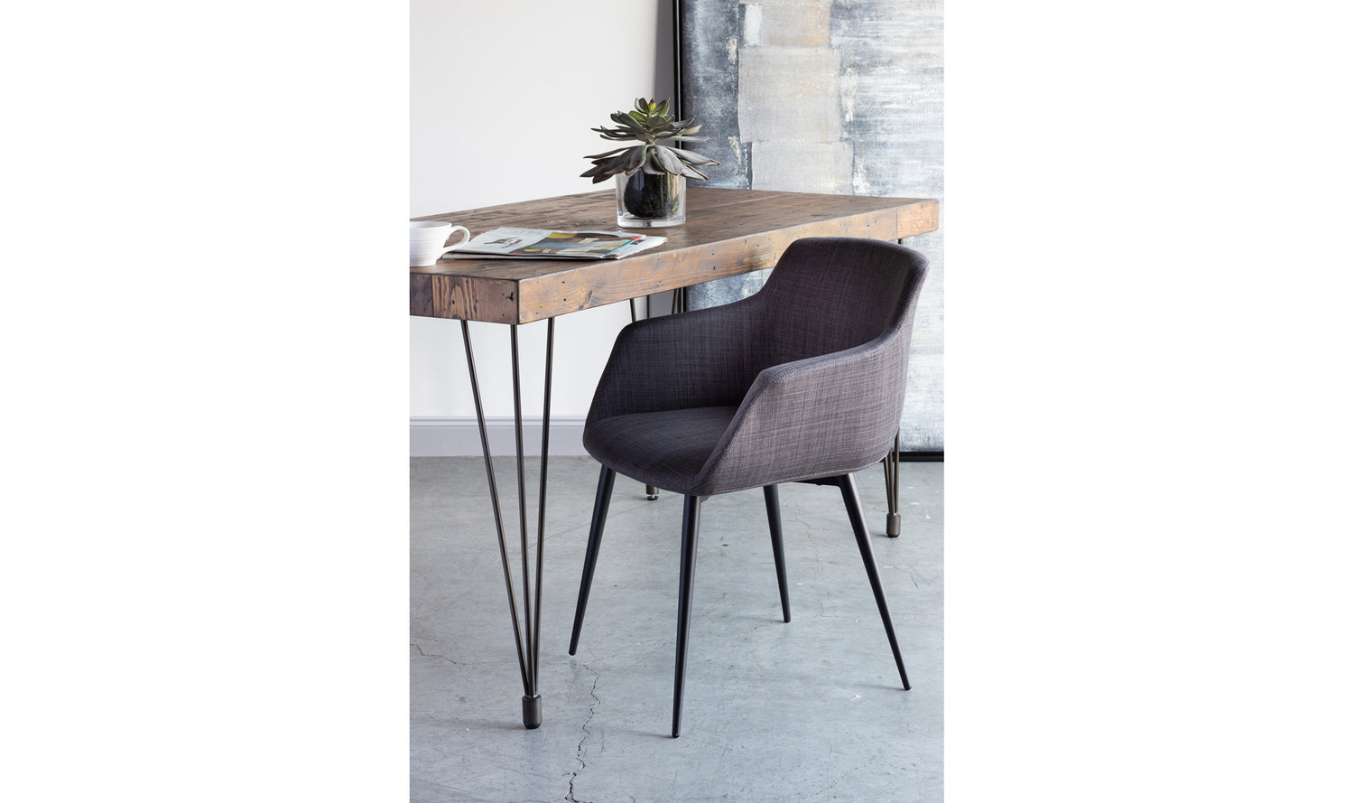The Ronda armchair combines classic mid-century design with a modern twist. Its uniquely sculpted seat offers comfort for dining, featuring foam padding and soft, easy-to-clean polyester upholstery. With a distinctive silhouette and steel hairpin legs, this chair adds elegance to any dining area.
