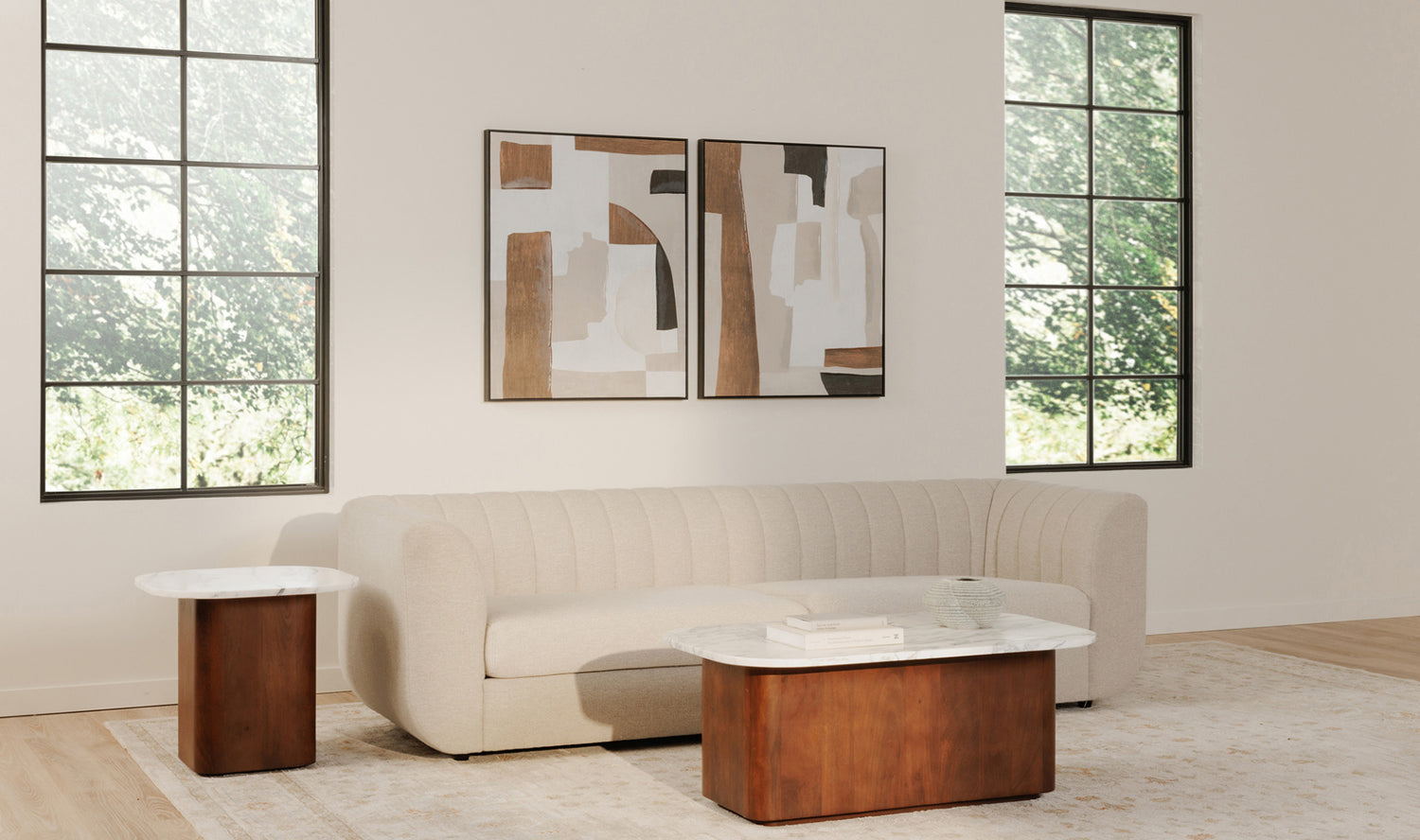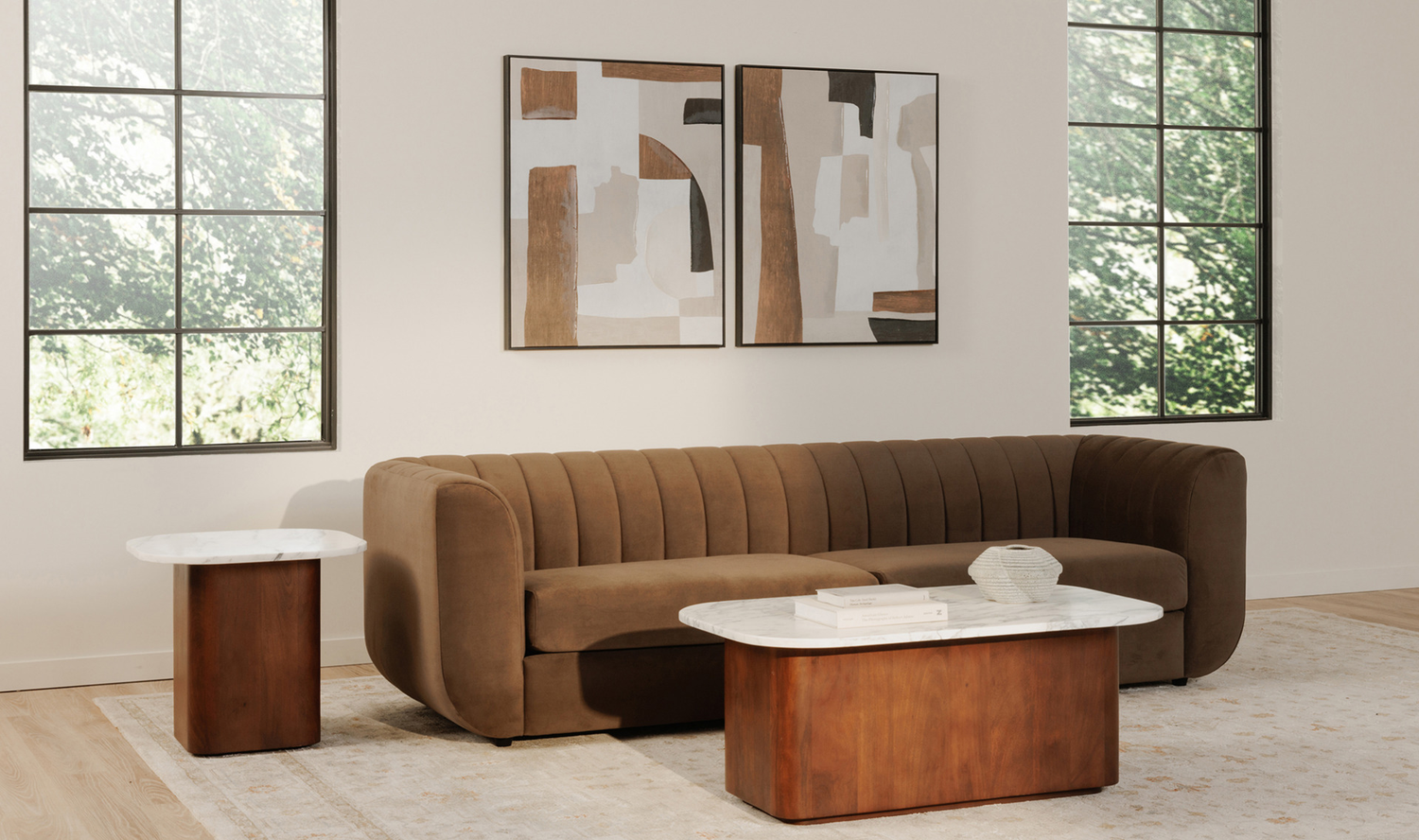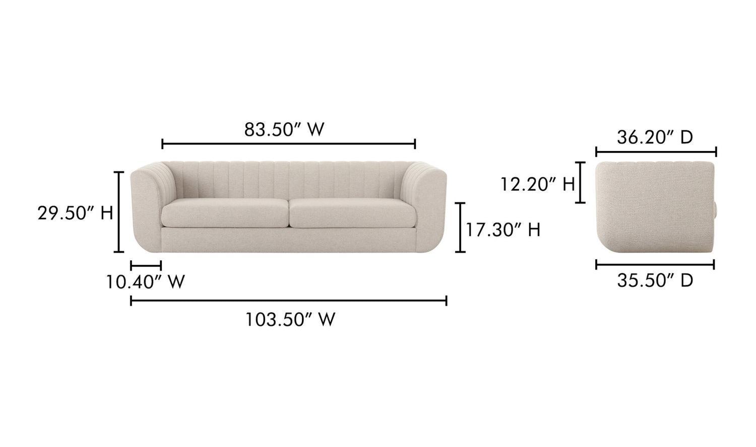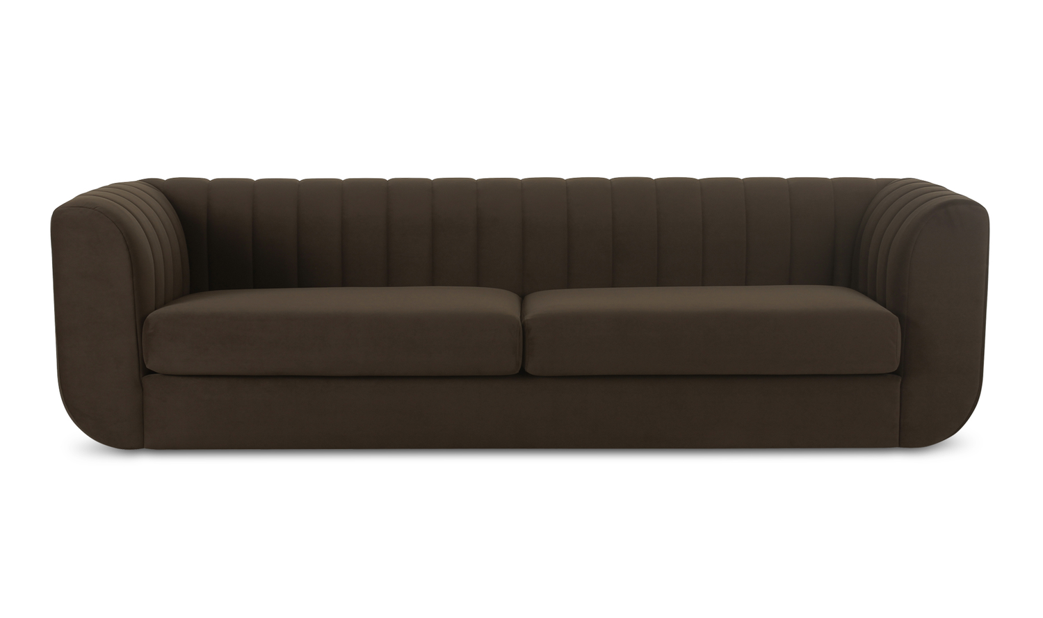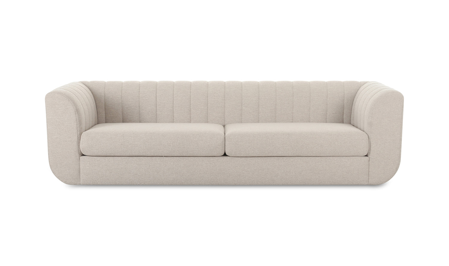 The Rosy sofa delivers the ultimate lounging experience with its oversized, curved silhouette. Featuring wide vertical channels that evoke Art Deco elegance, this piece offers a modern twist with textured neutral fabric upholstery, making it a versatile statement for any living space.