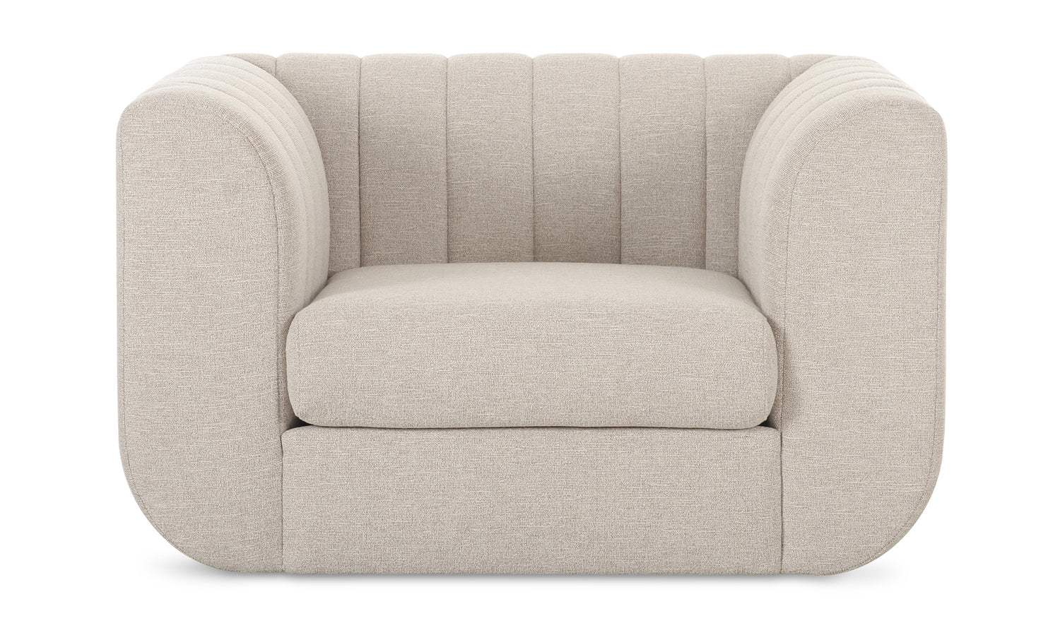 The Rosy lounge chair offers an exceptional lounging experience with its oversized, curved design. Its wide vertical channels pay tribute to Art Deco sophistication while introducing a modern twist with textured neutral fabric upholstery, making it a versatile centerpiece for any living space.
