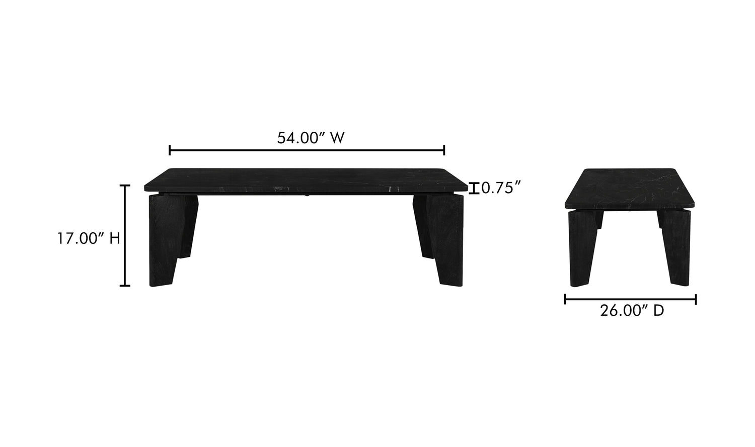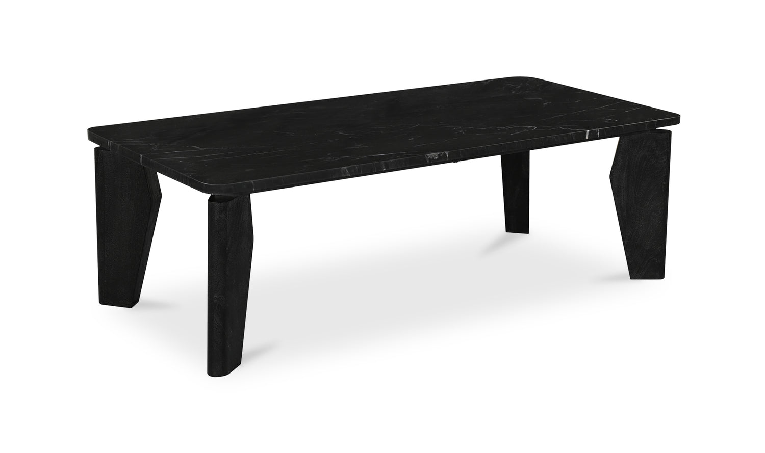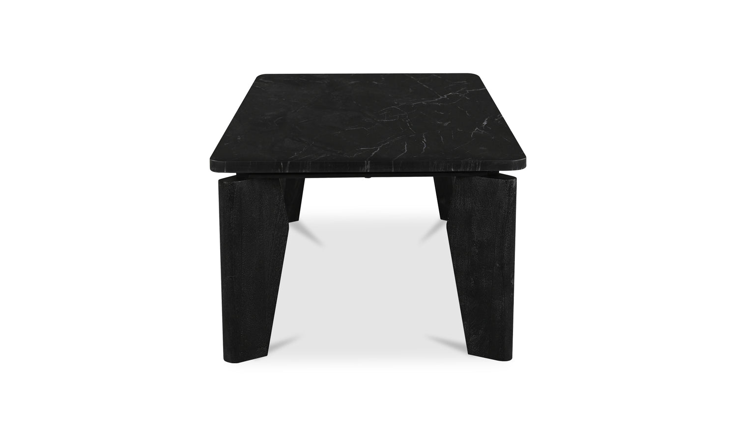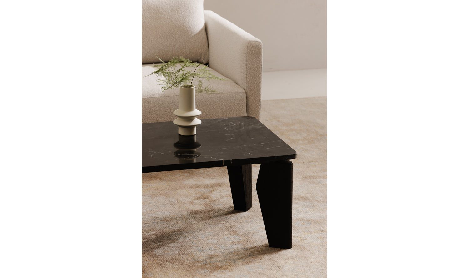 The Satona coffee table beautifully combines modern elegance and playful design, featuring gaps between the legs and tabletop. The striking black marble contrasts with the Acacia wood base, creating a sleek look, while detailed joinery adds subtle refinement.