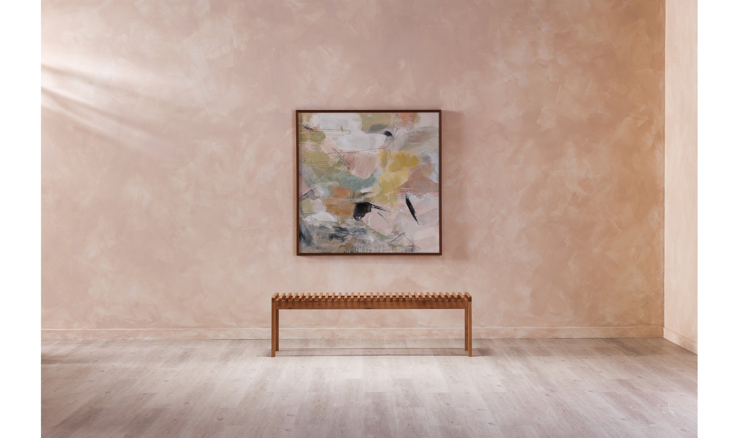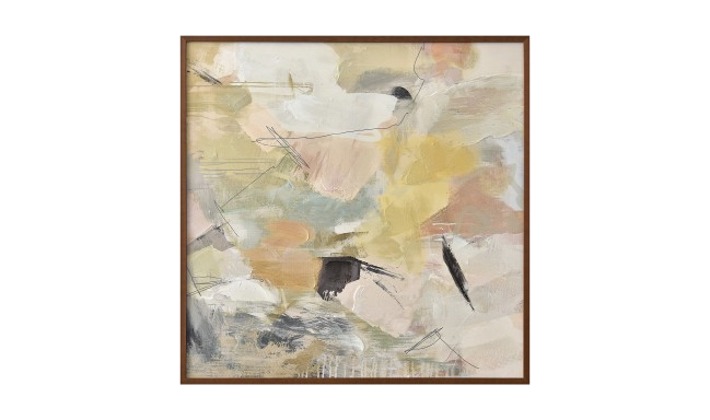 Serendipity blends soft, muted pastels with bold black shades, creating an abstract piece that exudes serenity and tranquility. The warm brown finish of the solid pine frame adds a vintage touch, enhancing the overall presentation.