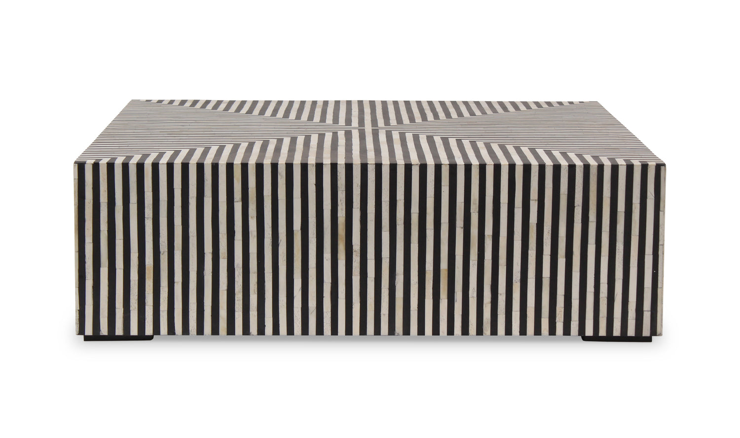 Simplistic and bold, the Ternin coffee table’s hypnotic art deco design is an exercise in contrast. A veneer of ethically sourced white and black camel bone with resin adds a visual statement that contrasts with its simple construction and square shape. The Terning series features a coffee table and a side table to better suit living spaces of all sizes and shapes.