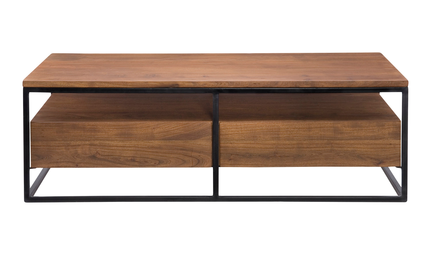 The Vancouver Coffee Table features a sleek, contemporary design, combining a solid acacia wood top with a sturdy iron frame. Its thoughtful design includes drawers for convenient storage, making it a practical addition to any living space.