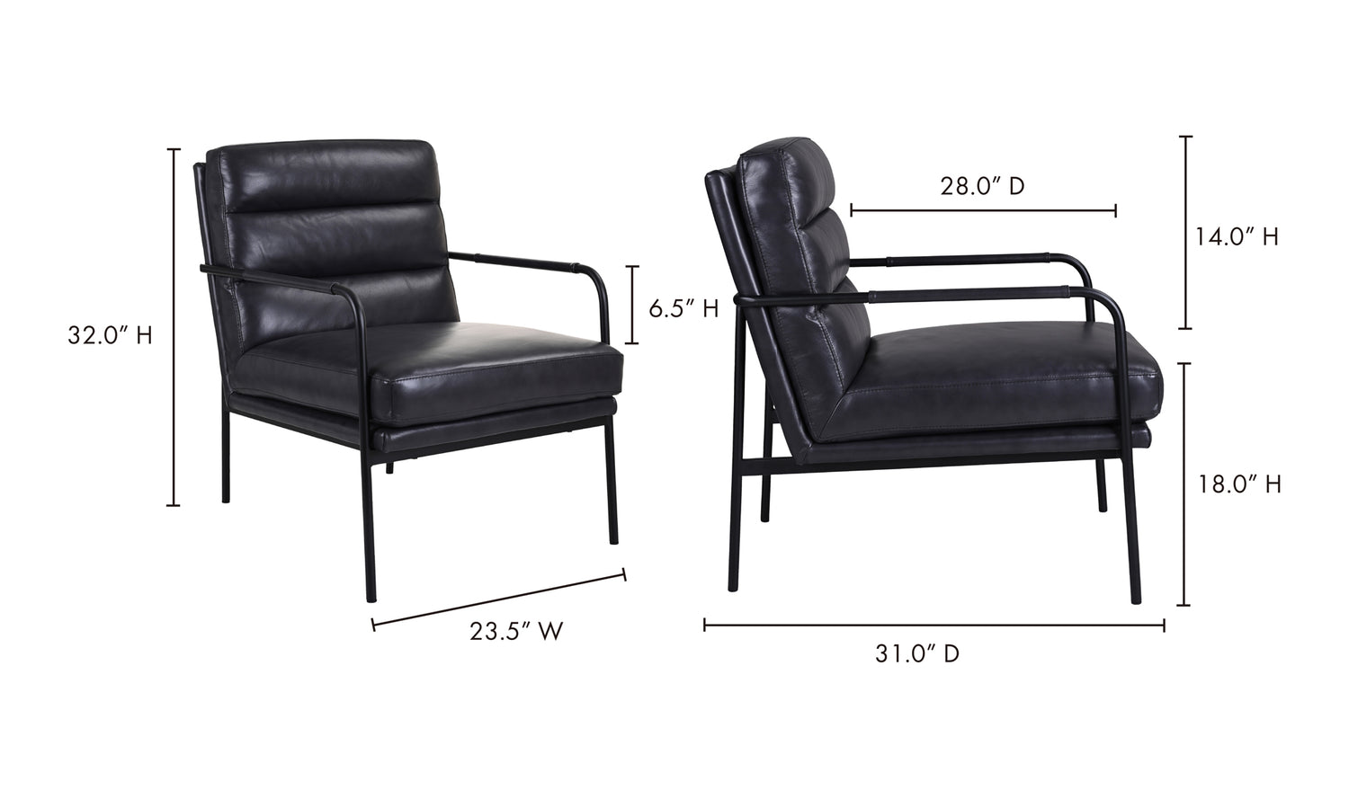 An old-school armchair with a modern edge - the Verlaine armchair. Upholstered in a top-grain, raven black leather that's sure to mellow with age and patina beautifully, its back support cushion is perfectly padded with gentle channeling, while Verlaine’s seat is supported with foam and zigzag springs. Offering rich relaxation, Verlaine's slim, powder-coated metal frame features slender arms wrapped with leather, a timeless, authentic style to work in any setting.